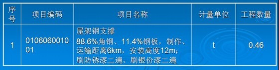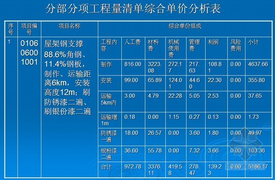 例:清單工程量:010606001001 型鋼支撐0.46t,該題中的人工、材料、機(jī)械臺(tái)班消耗量及單價(jià)按《浙江省建筑工程預(yù)算定額(2003)版》及《浙江省建筑安裝材料》2003年基期價(jià)格計(jì)取,管理費(fèi)按人工費(fèi)加材料費(fèi)的20%計(jì)取,利潤(rùn)按人工費(fèi)加材料費(fèi)的10%計(jì)取。風(fēng)險(xiǎn)費(fèi)用暫不計(jì)取。工程量清單如下所示: