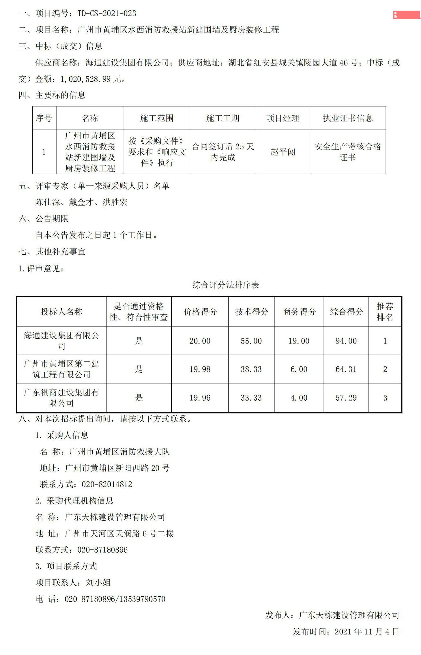 當(dāng)前位置:首頁(yè) ?>?招標(biāo)資訊?>?中標(biāo)公告廣州市黃埔區(qū)水西消防救援站新建圍墻及廚房裝修工程成交結(jié)果公告